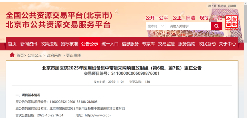 2025年11月14日(昨日),北京市属医院2025年医疗器械创新网集中带量采购项目招标有了新进展,1-5包发布了中标结果,7包暂无动态更新,8-9包则经历了废标后又发布重新招标公告的情况。