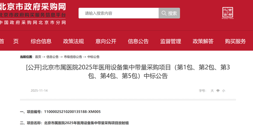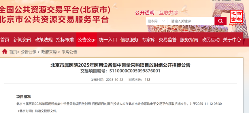 近日,器械之家从北京市公共资源交易服务平台获悉,北京市属医院2025年医疗器械创新网集中带量采购项目放射组公开招标工作正式启动,本次招标项目预算金额高达25084万元(人民币)。分9个包采购CT、DR、磁共振以及DSA等设备。