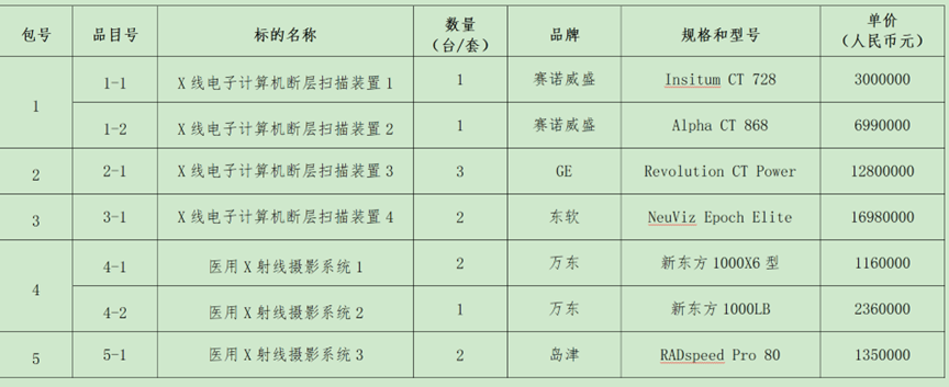 经统计,1-5包合计中标金额为8973万元。本次项目采购人为首都医科大学附属首都儿童医院。从目前已中标情况来看,在CT、DR设备的采购中,本土品牌东软医疗、赛诺威盛和万东医疗表现优异。